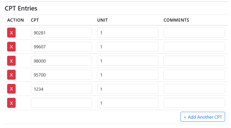• Multiple CPT Support: Add one or more CPT codes per entry — no limitations
