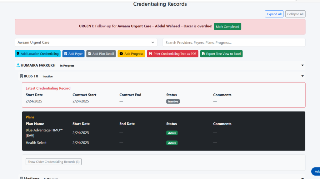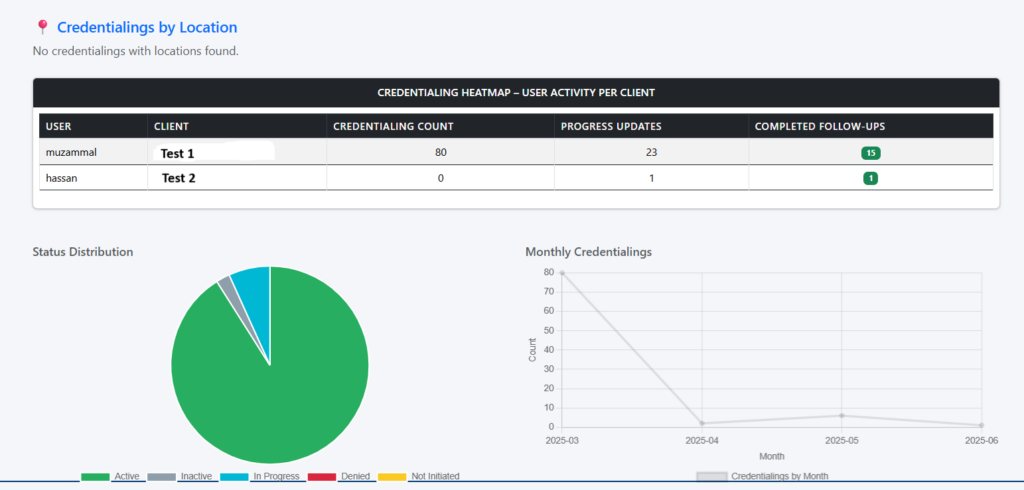 • Progress Tracking: Monitor ongoing credentialing efforts across teams