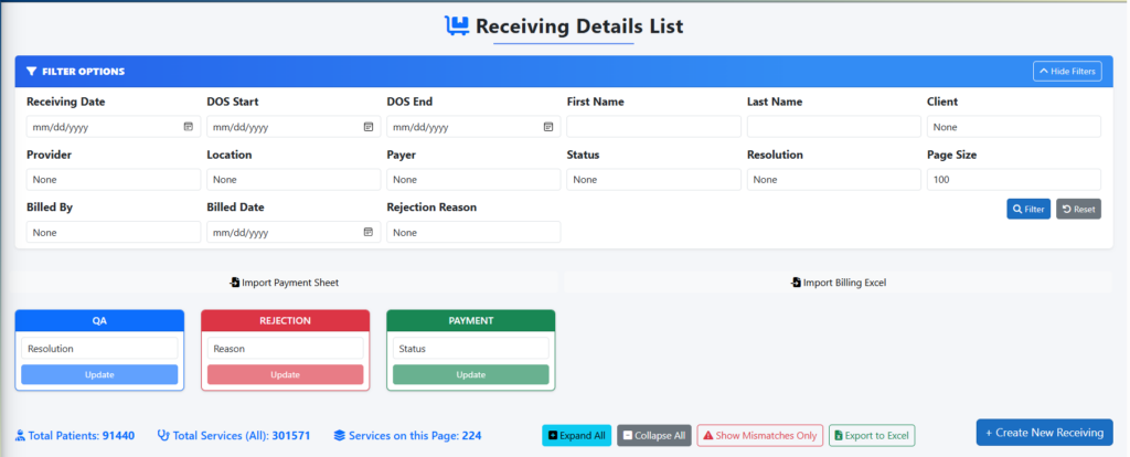 • Advanced Filters: Instantly sort records by Receiving Date, Date of Service (DOS), Client, Provider, Location, and more